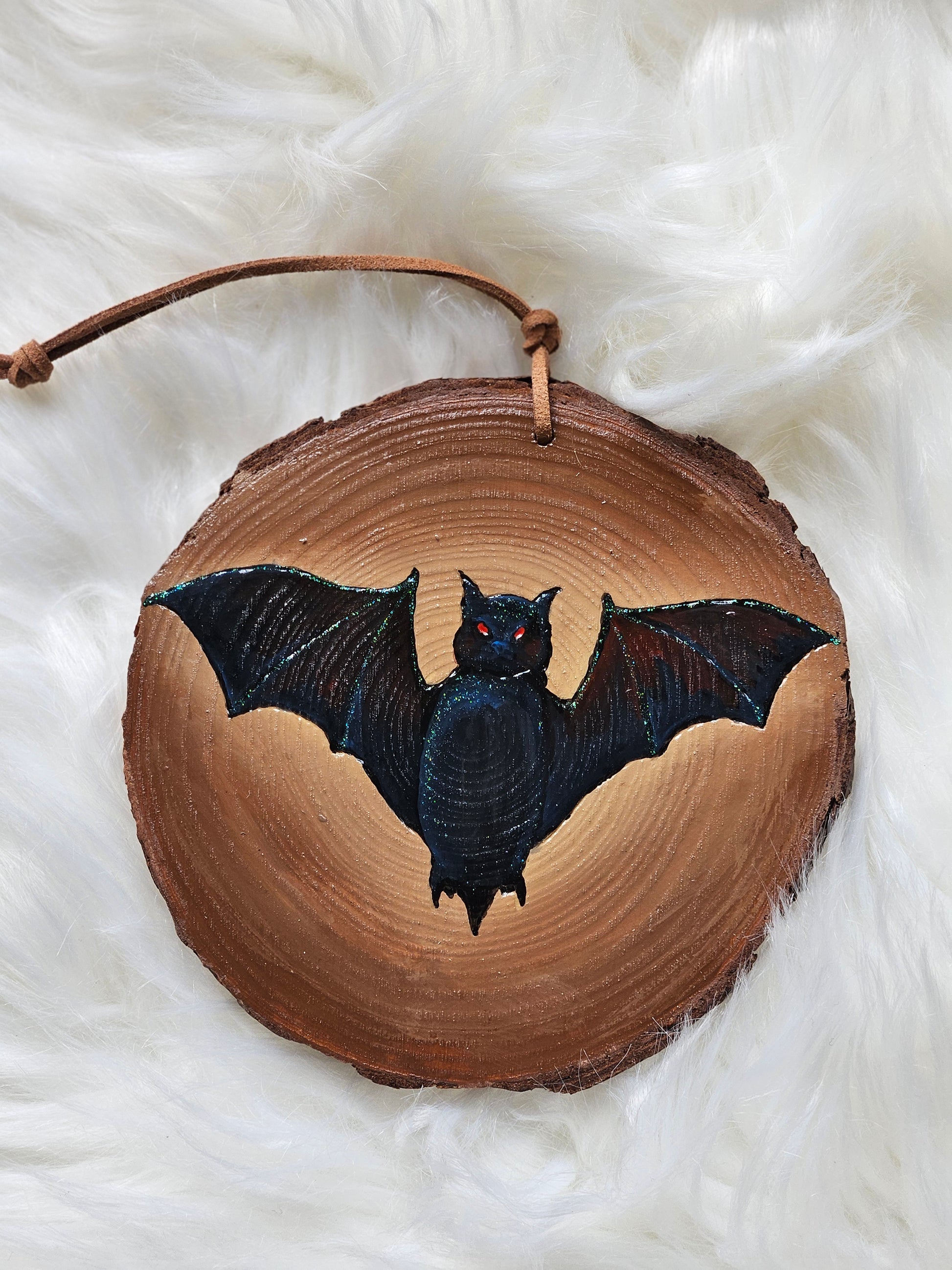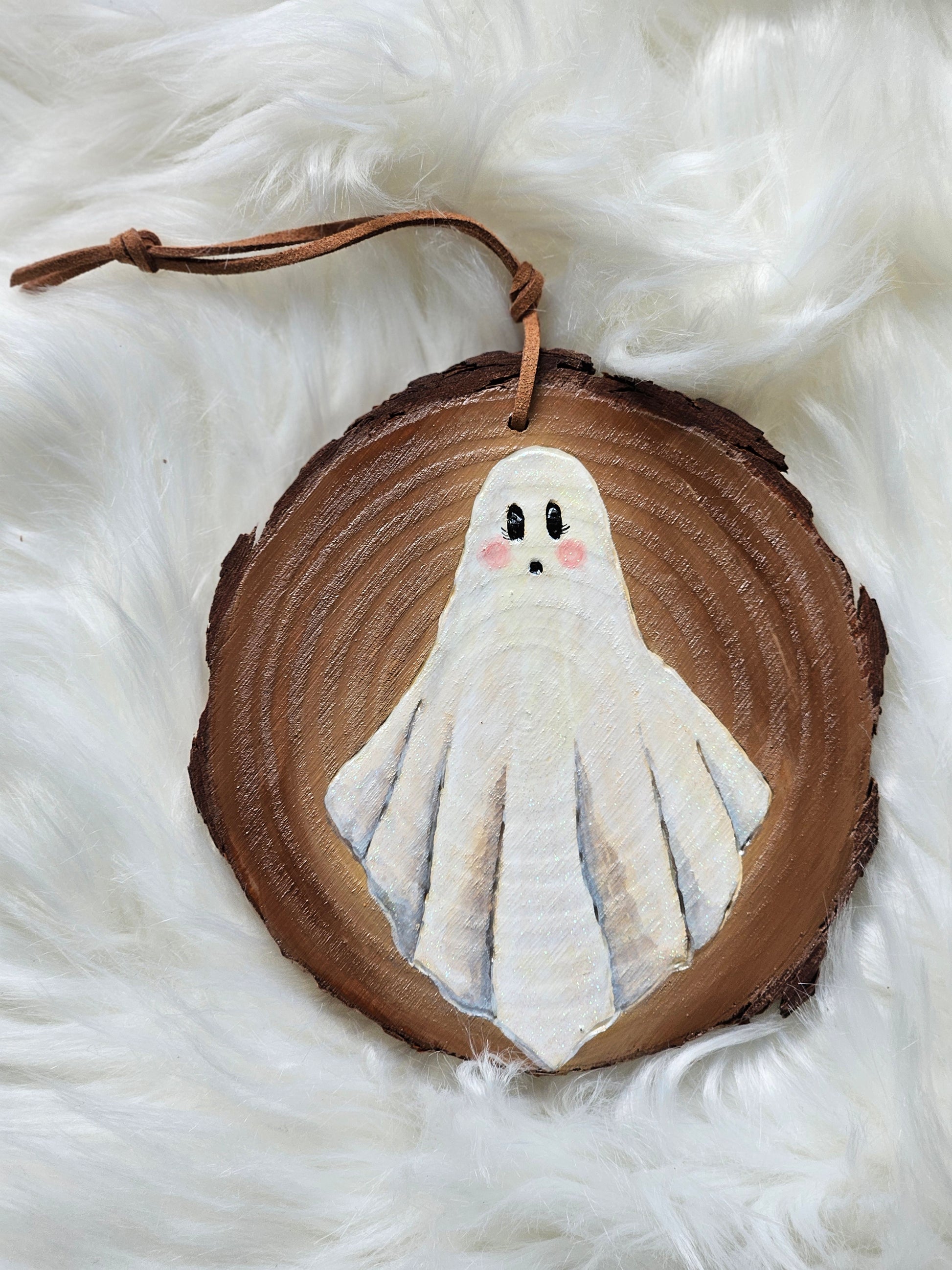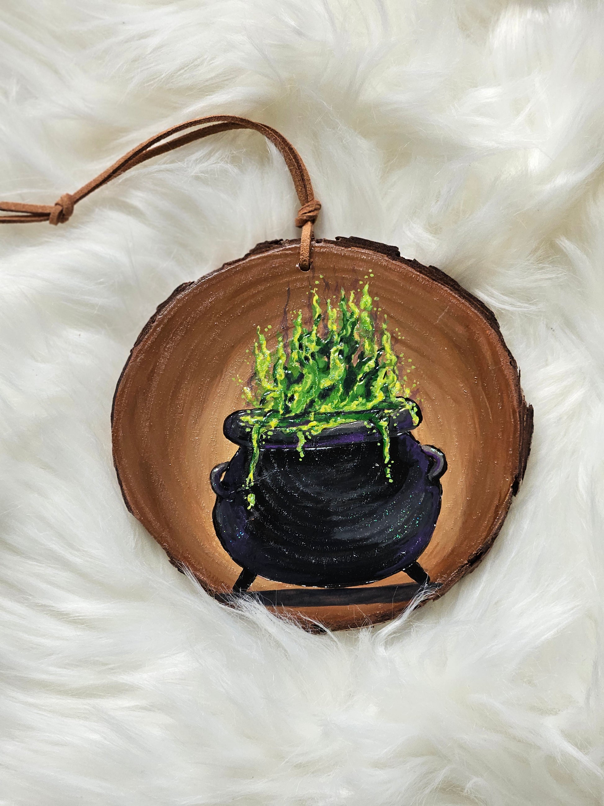 Four distinct Halloween themed woodburned and painted ornaments. Includes a witches cauldron, fun ghost, spooky bat and beautiful pumpkin.